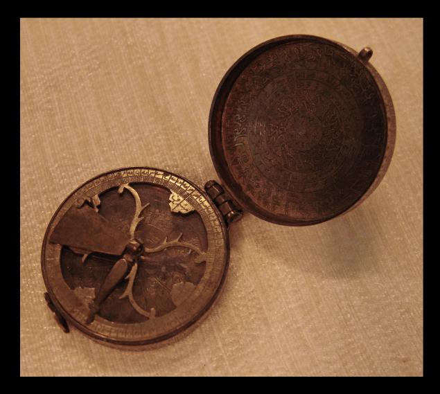 اثر به شکل دایره دارای دربی قفل دار و صفحه شیشه ای است که دورتا دور صفحه شیشه ای با فلز احاطه شده است. و تزئینات گیاهی دارد. زیر صفحه شیشه ای یک عقربه و روی آن نیز عقربه ای دیگر و یک قسمت فلزی وجود دارد. روی دسته اثر با تزئینات مشبک کاری و یک زبانه و روی درب آن نوشته ایی دیده میشود.