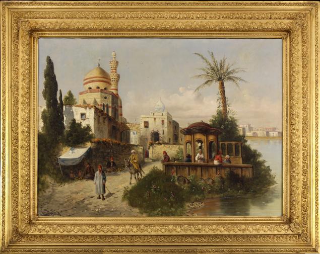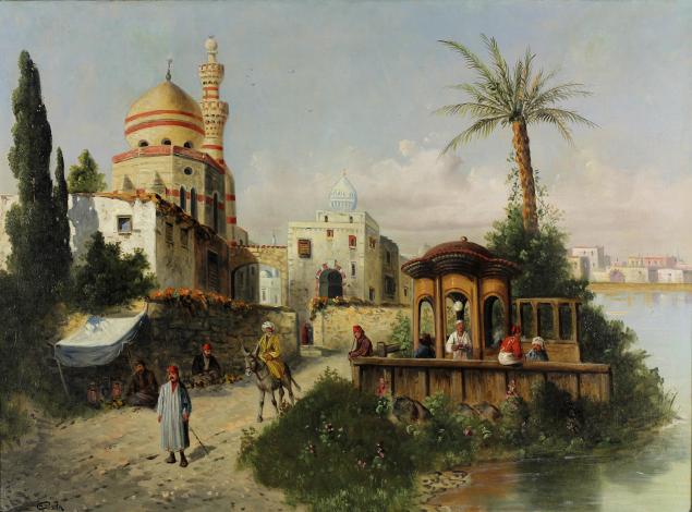 نقاشی گوشه ای آرام از شهر را در کنار رود خانه به تصویر کشیده است. مسجد و قهوه خانه ای که هم جوار یکدیگر هستند. چند دست فروش در پایین دیوارهای مسجد و در محل گذر مردم بساط کرده اند و روبروی آنان قهوه خان های چوبی در میان فضایی سبز مملو از بوته ها قرار گرفته. درخت نخلی پشت قهوه خانه است و پیچک ها دور آن رشد کرده اند و به زحمت به بالای آن می رسند. در قهوه خانه چند نفر نشسته اند.