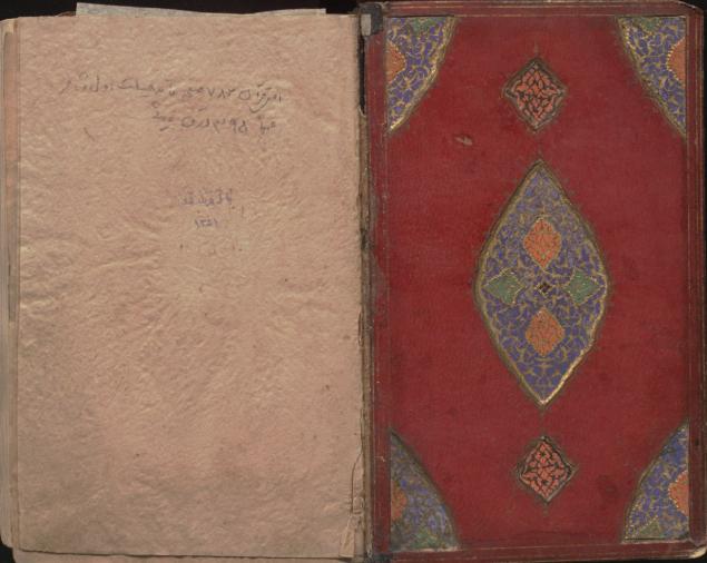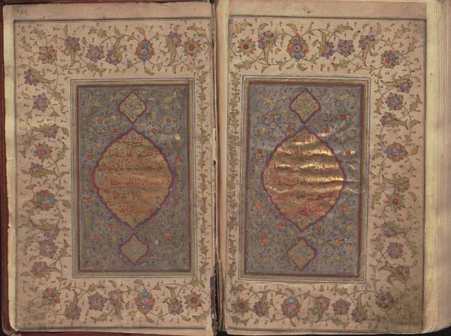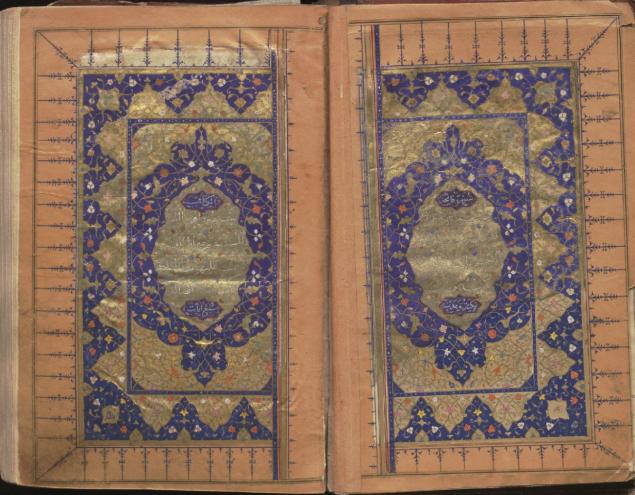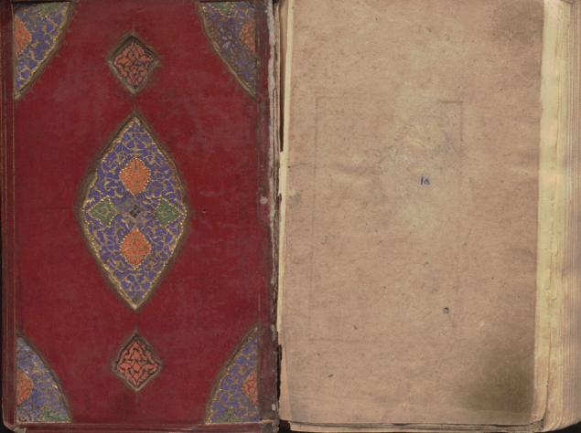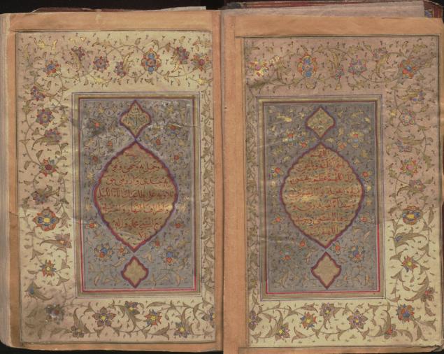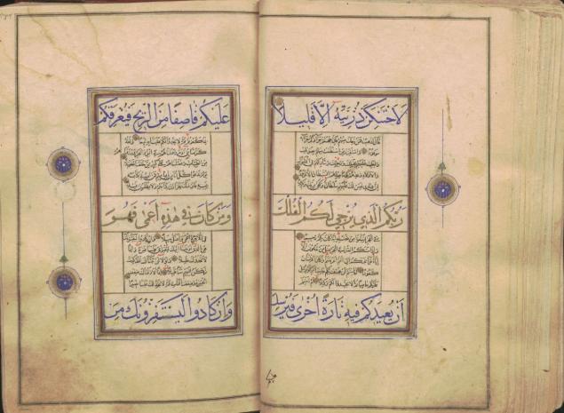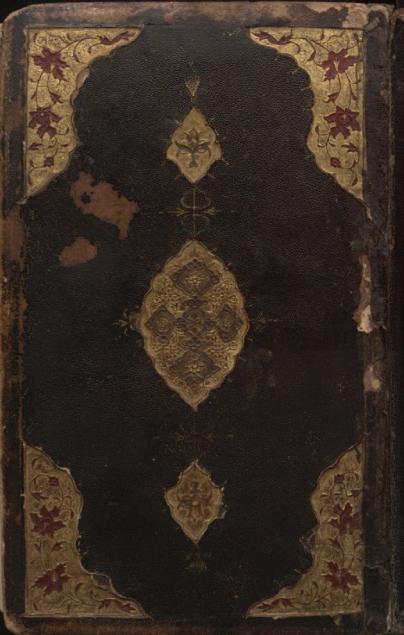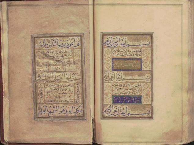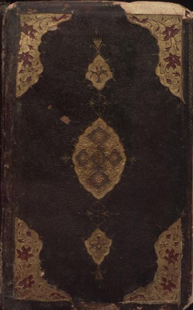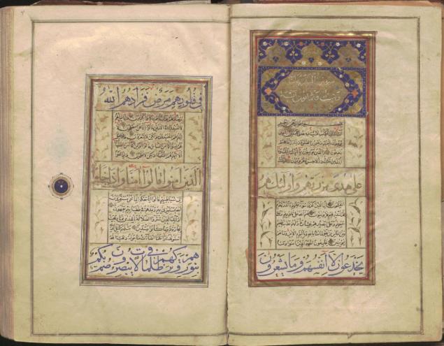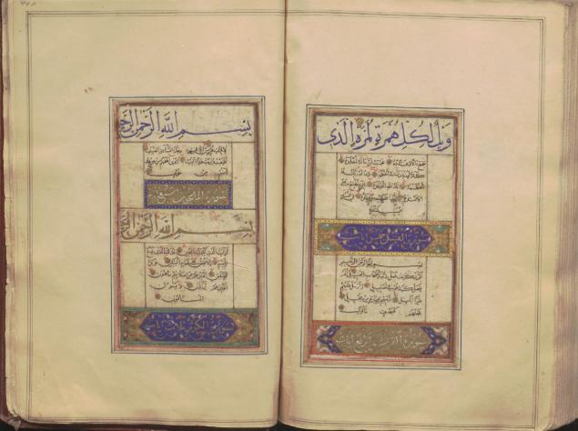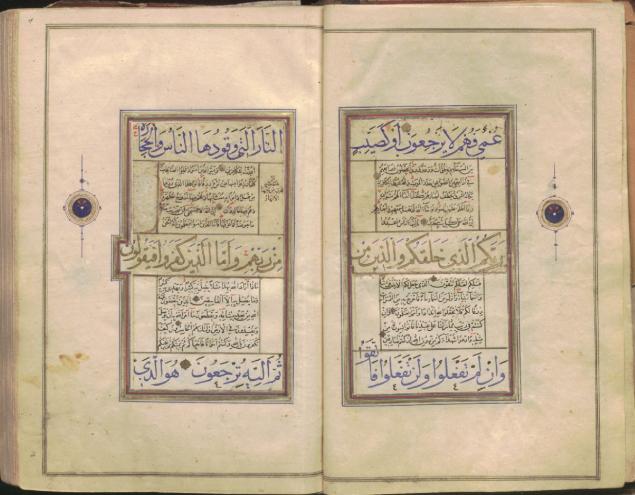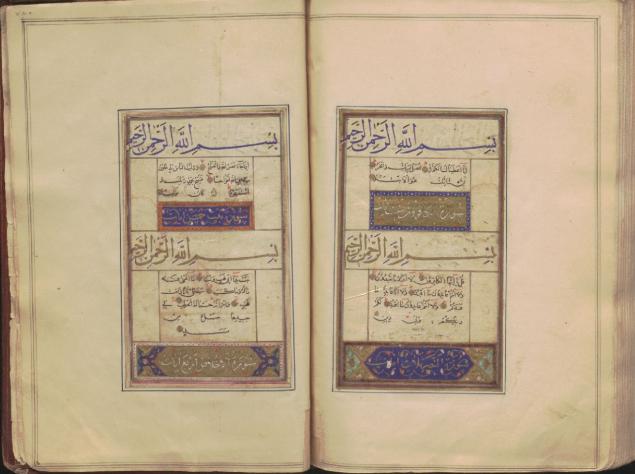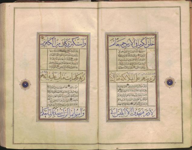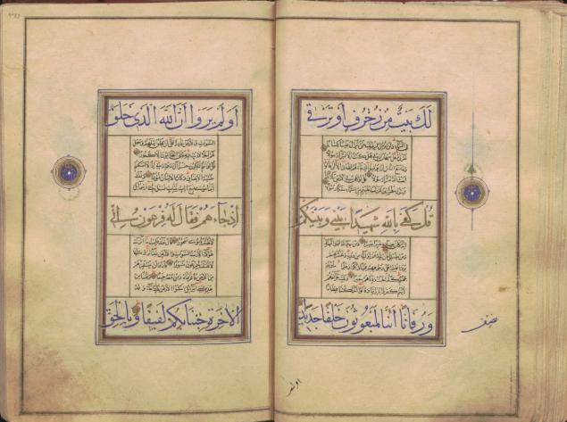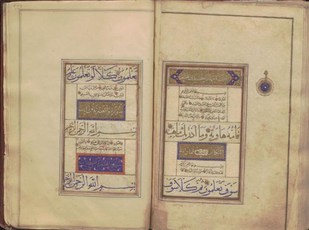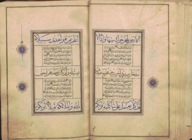 قرآن نفیس به خط نسخ کهن و ریحان. با اوراق مجدول سرسورهها و تقسیمات قرائتی مذهب/ هر صفحه سر سطر درشت بخط ثلث با زر یا لاجورد و هشت یا ده سطر بخط نسخ ریز مشکی با علائم شنگرف/ متن دو صفحه اول مذهب بانضمام دو صفحه اول و آخر دعای قرآن در تذهیبی از گل و بوته. جلد ضربی مشکی.