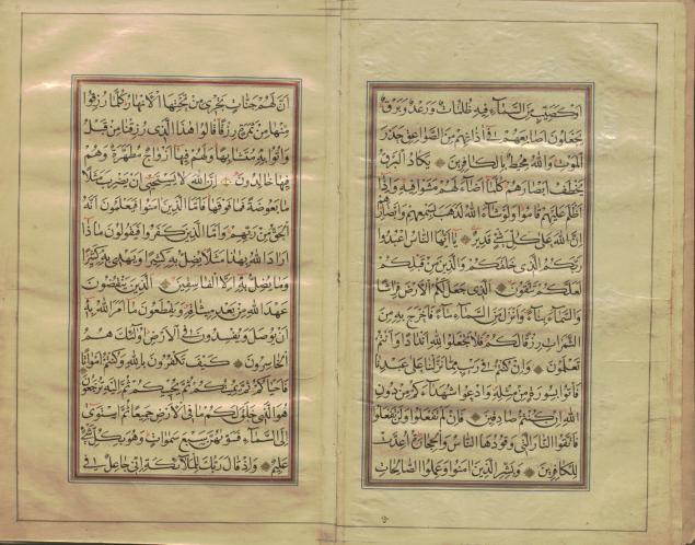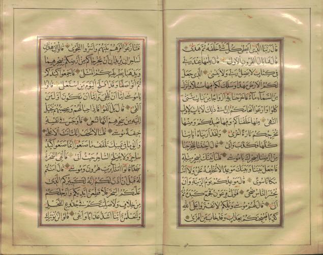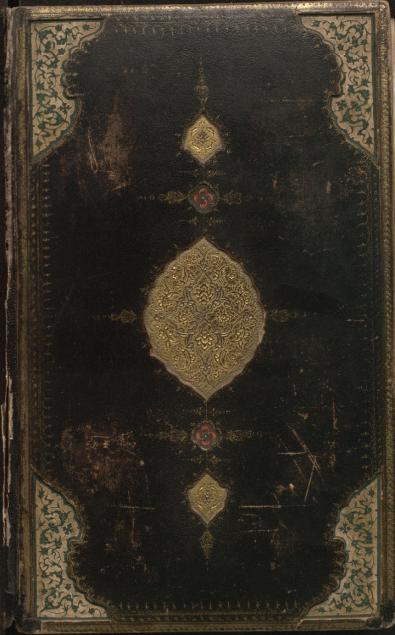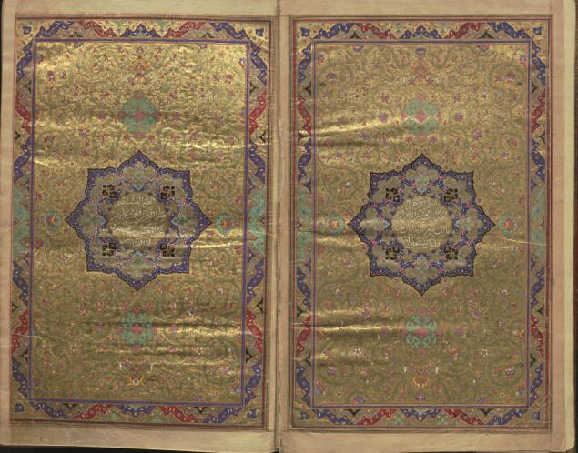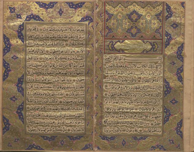 این مصحف شریف در تاریخ صفر سال 1094قمری به خط نسخ محمدابراهیم قمی بر روی کاغذ خانبالغ کتابت شده؛ دو صفحهٔ آغازین تمام مذهّب مرصّع که سورهٔ حمد در داخل ترنج طلااندود با سفیدآب کتابت شده؛ دو صفحهٔ بعد دارای یک سرلوح و حاشیهٔ مذهّب مرصّع؛ سرسوره ها و علایم جزو و حزب  درون ترنج مرصّع؛ علایم وقف به شنگرف؛ فواصل آیات ستارهٔ زرّین و علایم سجده به زر؛ تمام اوراق زرافشان و مجدول مطلا محرّر کمنداندازی شده؛ جلد ضربی ترنج دار طلاپوش با آستر تیماج سرخ ضربی با زمینهٔ سبز و جدول طلاکوب است.