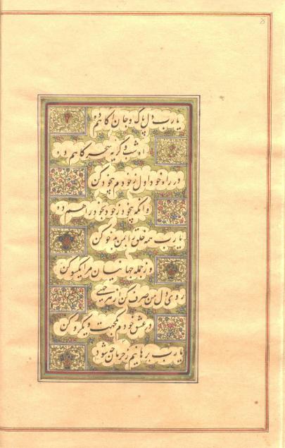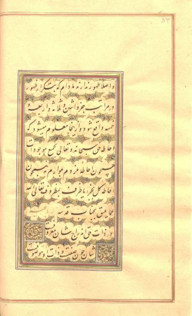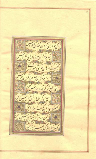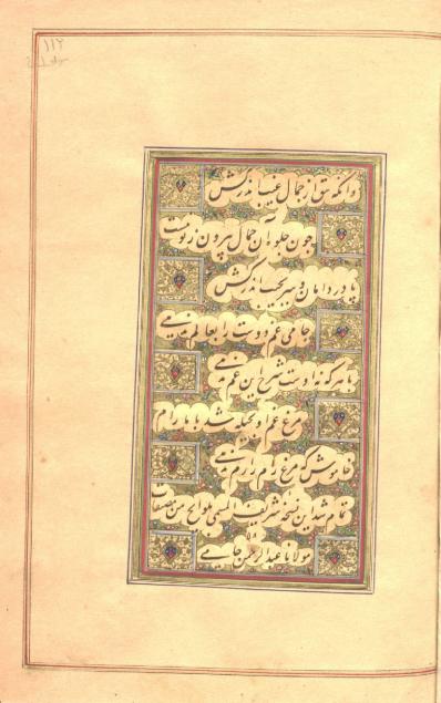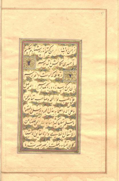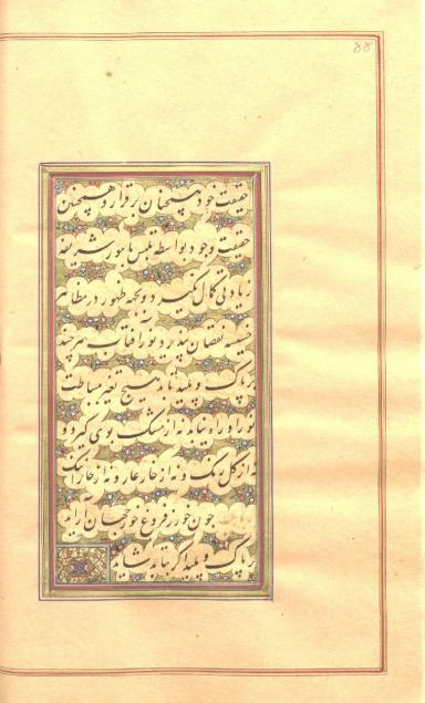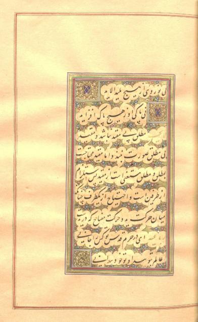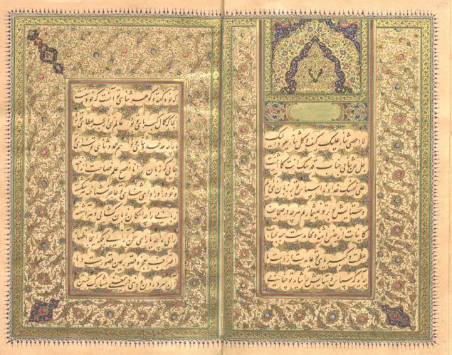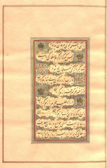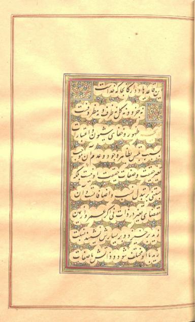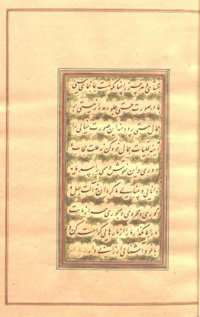 تالیف جامی، نستعلیق خوش ، ص 1و2 مذهب دارای سرلوح ، میان سطرهای همه ی صفحات طلا اندازی شده همراه با جدول زرو شنگرف و کمند زرو شنگرف، برخی کلمات به زر، بر کاغذ فرنگی آهار مهره در 56 برگ9سطری نوشته شده، جلد رویه ترمه مغزی میشن سرخ.