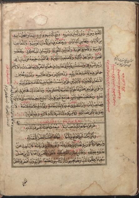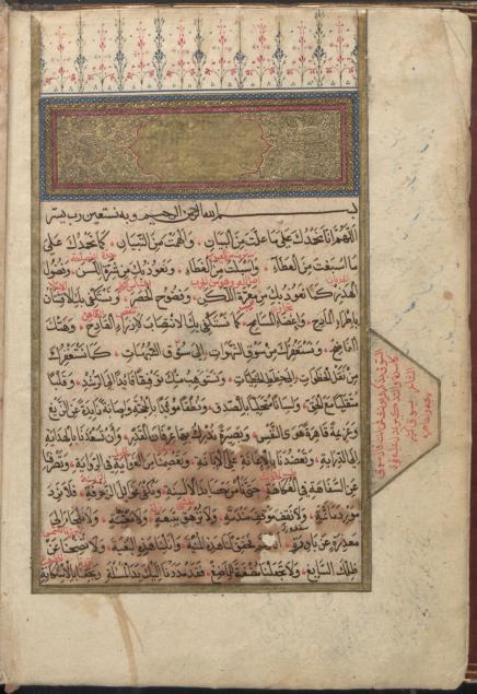 تالیف أبو محمد قاسم بن علی بن محمد بن عثمان الحریری البصری (۴۴۶- ۵۱۶ ق) است ؛ وی این کتاب را به تقلید از شیوه بدیع الزمان همدانی در ۵۰ مقامه نگاشته و در تصنع و تکلف از او نیز در گذشته است.مقامات، جمع «مقامه»، قسمی است از اقسام قصص است که با صرف نظر از تکلفات لفظی و معنوی که در آن هدف اصلی است، از جنبه داستانی هیچ گونه ارزش و تنوعی ندارد و مقصود نویسنده از ابداع و انشاء آن این است که بتواند با فراغ بال و وسعت مجال، هر چه بیشتر صنایع لفظی و بدیعی به خصوص سجع را در آن به کار برده و در لغت پردازی و ترکیب سازی، نهایت هنر خود را در فن نثر نویسی به شیوه معمول در این دوره ارائه دهد. از جنبه داستانی، مقامات عبارت است از داستانهایی کوتاه و مستقل که تنها وجه ارتباط آنها با یکدیگر راوی واحدی است که شخص معینی را در حالات مختلف وصف میکند. هم چنین دانستنی است که نام هر مقامه، ماخوذ از مکانی است که داستان در آن اتفاق افتاده مانند مقامه حلبیه، مقامه موصلیه؛ نسخ سده 11، دارای کتیبه به زر و شنگرف و لاجورد، جدول به زر، عناوین و نشان ها شنگرف، بر کاغذ ترمه در 121 برگ 17 سطری نوشته، جلد اثر میشن قهوه ای ضربی و آستر تیماج سرخ است.