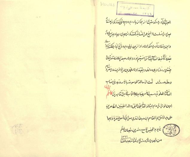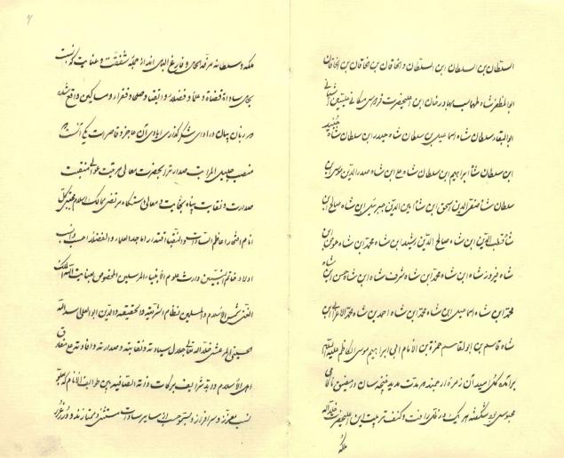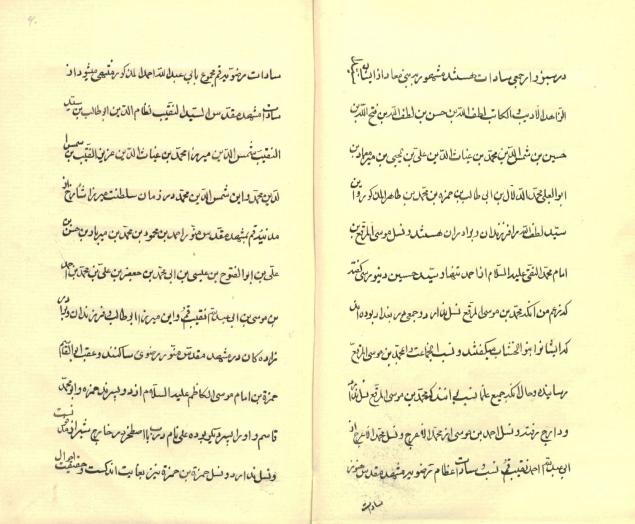 تالیف محمدقاسم بن حسن المختارالحسینی عبیدلی به نام شاه طهماسب صفوی و ابوالعلی اسدالله المرعشی، نسخ و نستعلیق ابوالقاسم بن عبدالقدیر سرابی در شعبان 1321 برای میرزا کاظم خان امین الوزاره، عنوان شنگرف، بر کاغذ فرنگی در 58 برگ 11 سطری نوشته شده، جلد اثر تیماج قهوه ای لایی است.