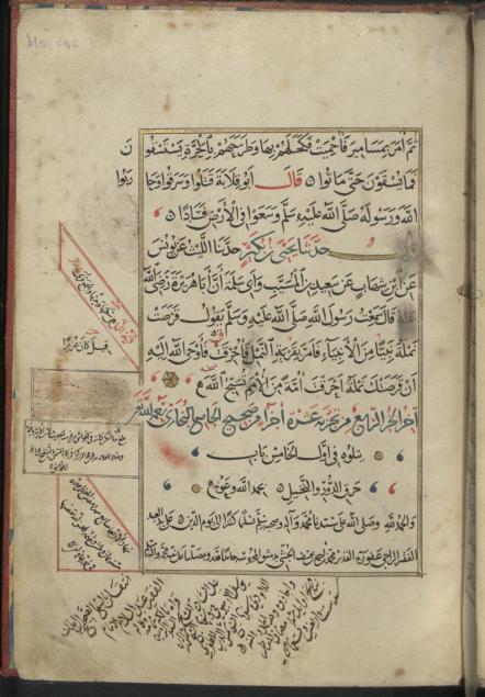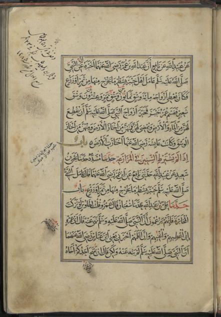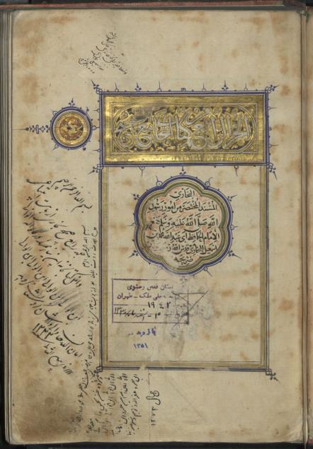 تالیف محمد بن اسماعیل بخاری، نسخ محمد بن احمد بن یوسف جشی در دمشق در 7 رمضان 828، با پیشانی و ترنج زرین، جدول به زر، عنوان و نشان شنگرف و زر، تملک محمد بن احمد بن محمد ابوبکر کندری در صفر 935، یادداشت تملک عبدالسلام امام مکه که آن را بر یوسف ارمیوی و شمس الدین داودی و شمس الدین مظفر در رمضان 946 خوانده و اجازه گرفته، یادداشت تملک فرهاد میرزا در 23 ربیع الاول 1285، بر کاغذ دولت آبادی در 183 برگ 13 سطری نوشته شده، جلد اثر رویه پارچه ای با سجاف تیماج سرخ است.