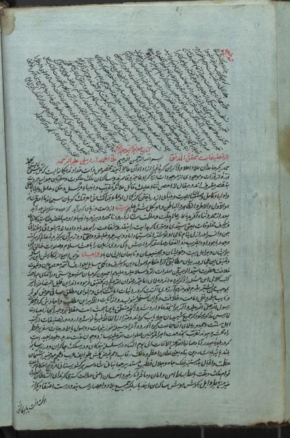 تالیف ملا احمد اردبیلی، جلد دوم، نسخ و نستعلیق میرزا بابا بن محمدجعفر در 20 ربیع الثانی 1225 در تهران، عنوان و نشان شنگرف، بر کاغذ فستقی آبی در 170 برگ 37 سطری نوشته شده، جلد اثر تیماج قهوه ای است.