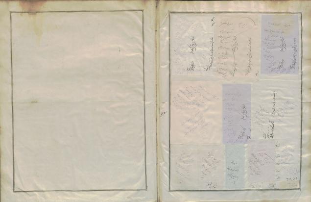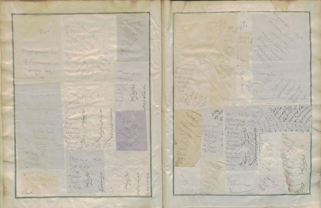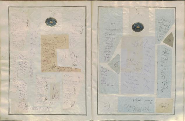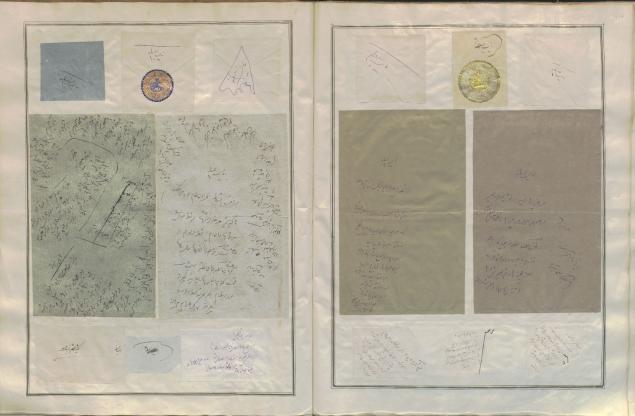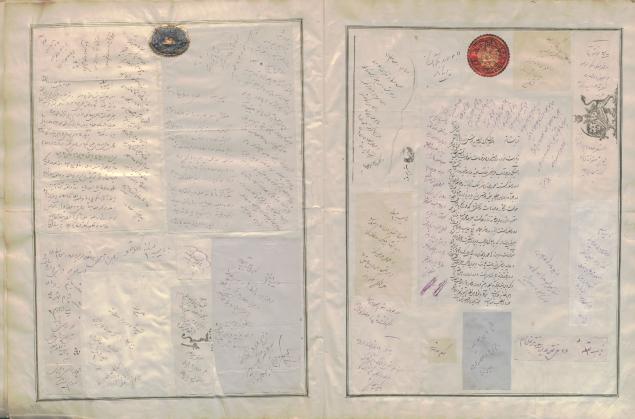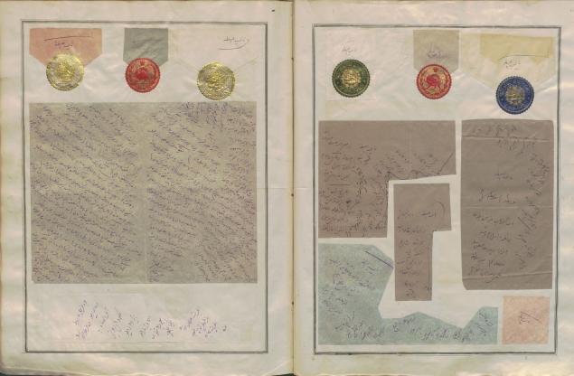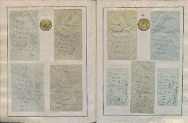 دست خط ناصرالدی نشاه با مهر و امضای او خطاب به نایب السلطنه کامران میرزا درباره مسائل سیاسی و اداریآن روزگار و نامه های نایب السلطنه به شاه و کسانی و کسانی دیگر که در کنار بیشتر آنها به خط خود دستور داده است متن بیشتر نامه ها را چیده و از میان برده اند تنها نوشته ها و دستورهای شاه را پهلوی هم چسبانده اند فرمان ها و منشورها و دستور و صورت حساب های مورخ 1298 تا 1303نیز در آن هست پاکتها و امضاها و نشانیها برخی و مهر ها را در کنار هم چسبانده اند.ای نامه ها دراخل یک کیف چرمی قفل دار بوده که لبه دار است