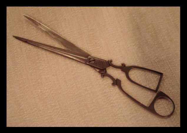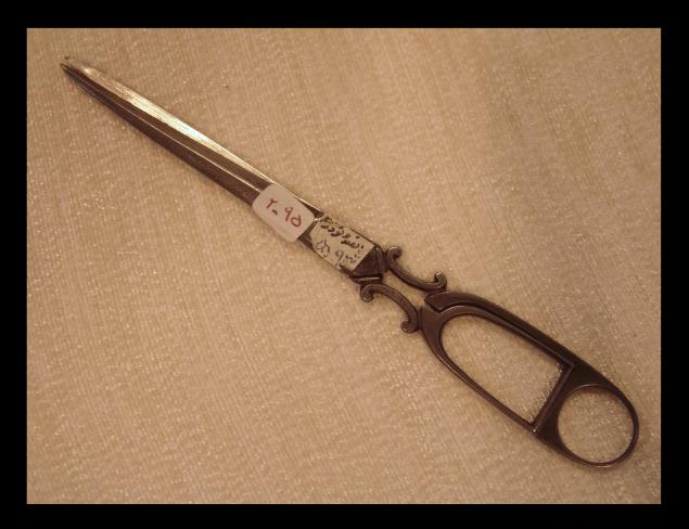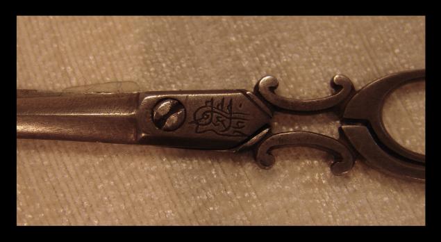 قیچی ساده و ظریف بدون تزئینات که در محل اتصال دو تیغه دارای نوشته ای ناخوانا است.