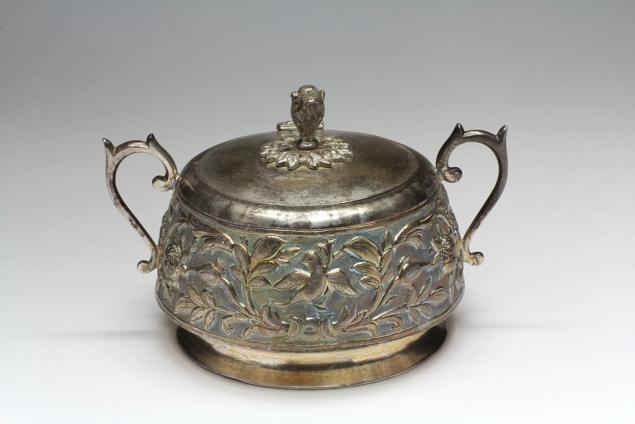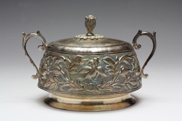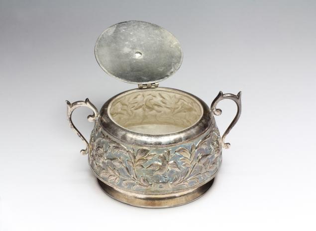 قندان نقره با نقوش گل و مرغی گرداگرد بدنه، اجرا شده به شیوه قلمزنی و درب لولا دار متصل به بدنه.
