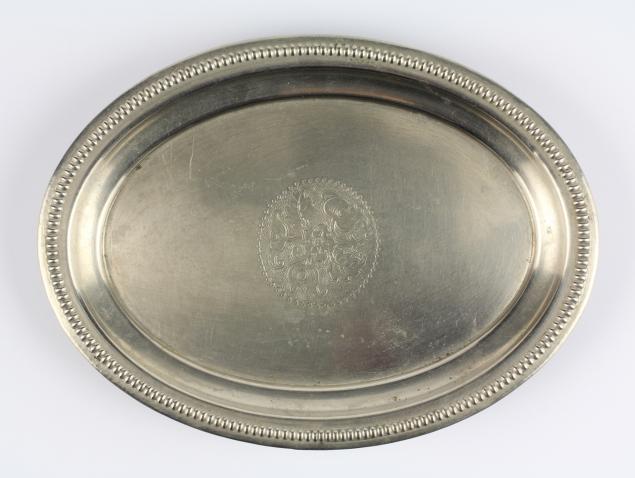 سینی کوچک بیضی شکل به نام فرمانبر، متعلق به حدود 100 سال پیش، از جنس ورشو با تزیینات قلمزنی.