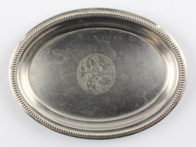سینی کوچک بیضی شکل به نام فرمانبر، متعلق به حدود 100 سال پیش، از جنس ورشو با تزیینات قلمزنی.