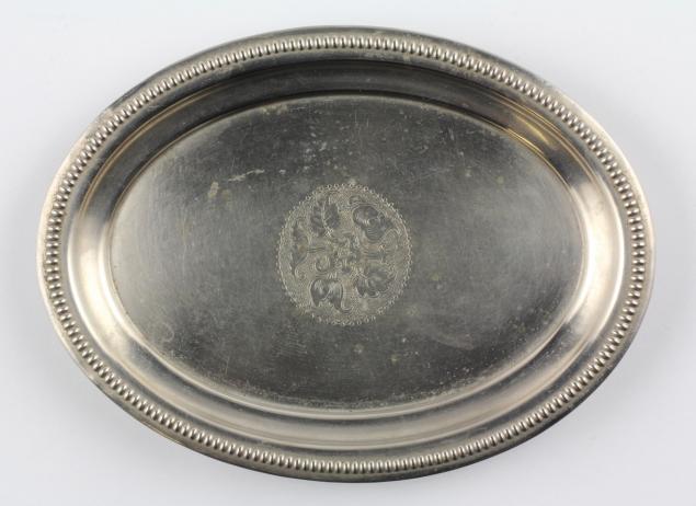 سینی کوچک بیضی شکل به نام فرمانبر، متعلق به حدود 100 سال پیش، از جنس ورشو با تزیینات قلمزنی.