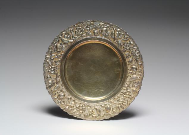 پیشدستی نقره با نقش گل و مرغ در حاشیه