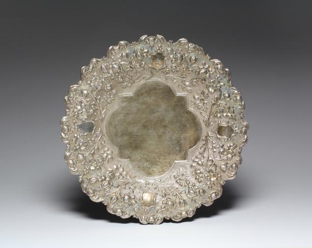 پیشدستی نقره با چهار پایه، کف ساده با حاشیه ی پر نقش گل و مرغی.