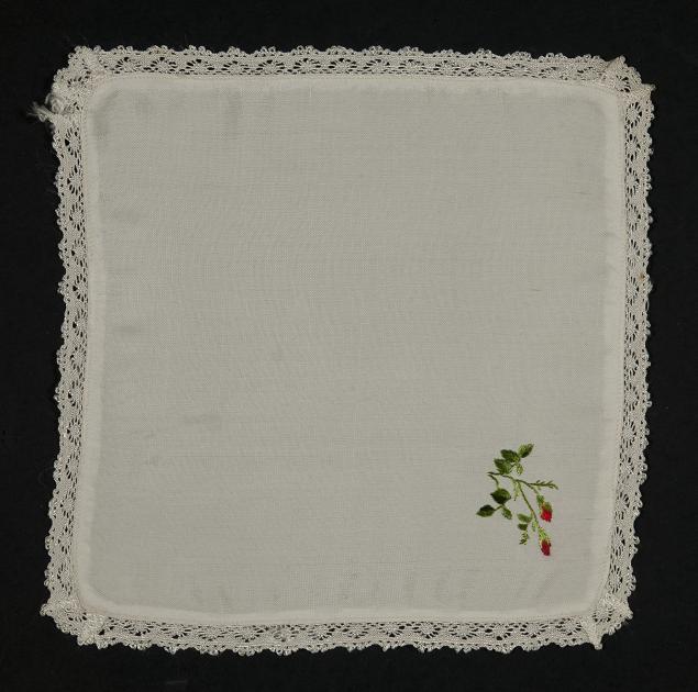 این دستمال با نوار باریکی از تور در دورتا دورآن و گلدوزی دو غنچه گل رز قرمز در یکی از گوشه ها تزیین شده است.