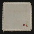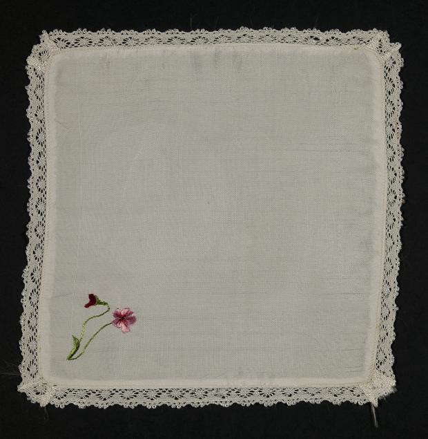 این دستمال با نوار باریکی از تور در دورتا دورآن و گلدوزی یک گل پنج پر صورتی در یکی از گوشه ها تزیین شده است.