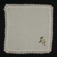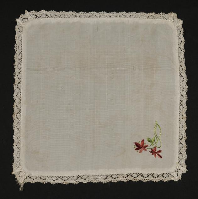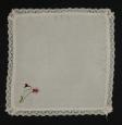 این دستمال با نوار باریکی از تور در دورتا دورآن و گلدوزی دو گل پنج پر قرمز در یکی از گوشه ها تزیین شده است.