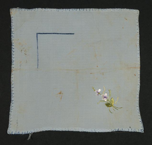 دستمال کوچک حریر ژرژت آبی با گلدوزی و دندان موشی بسیار ابتدایی.