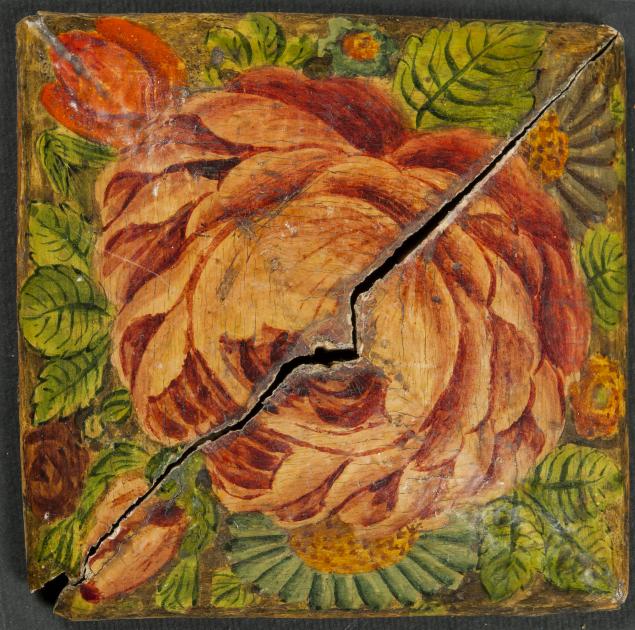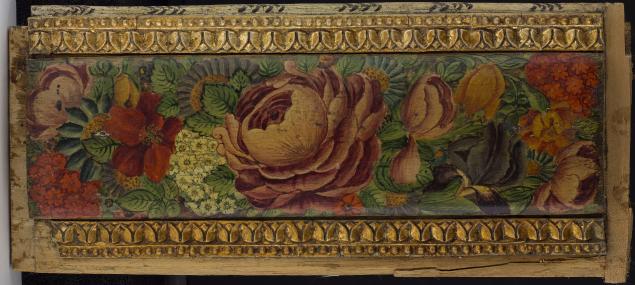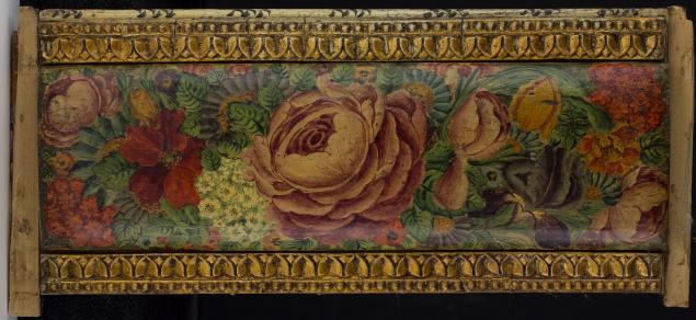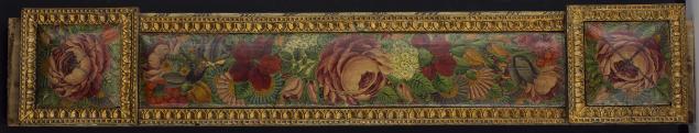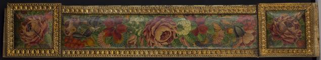 چهار قطعه احتمالا مربوط به نقاشی در یک بنا بوده است. که از بنا جدا شده و می تواند تبدیل به یک قاب شود. لبه های اثر طلایی با نقوش برجسته مثلثی شکل است. این اثر فاقد رقم می باشد.