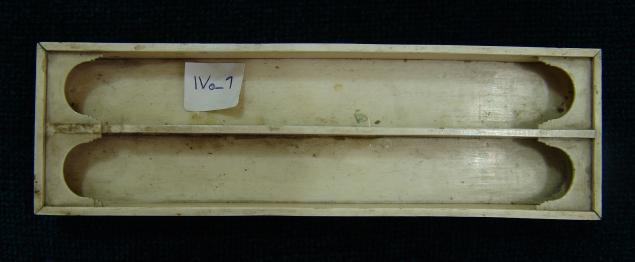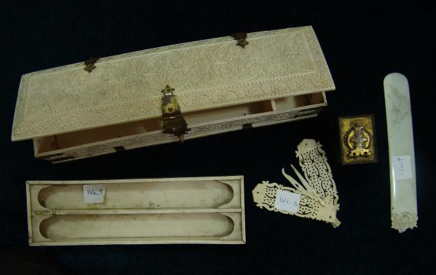 قلمدان عاجی مکعب مستطیل جعبه ایی شکل با نقوش گیاهی گل و بوته ایی بر روی آن.این قلمدان دارای جای قلم و دو دوات برنجی با درب طلایی رنگ است. یک قط زن استخوانی و یک پاکت نامه باز کن.