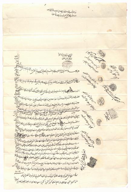 مصالحه نامه بین بی بی کوچک فرزند حاجی حبیب زانی و آقا میرزا عبدالوهاب پیرامون واگذاری ملک موروثی اش به خط شکسته تحریری دارای کاغذ کرم رنگ و 11 مهر بر روی سند