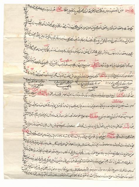 مصالحه نامه حاجی میرزا زین العابدین فرزند آقا میرزا عبدالوهاب به وکالت از برادر و خواهرانش با آقا علی محمد فرزند آقا محمد هاشم پیرامون واگذاری املاک و اراضی در قریه آهنگران اصفهان به خط شکسته تحریری