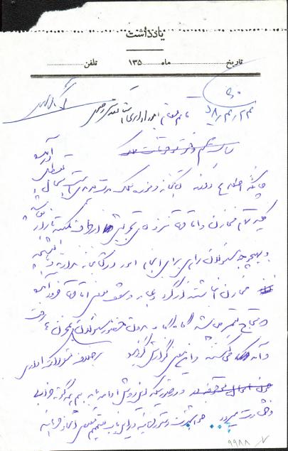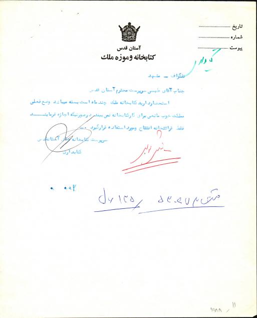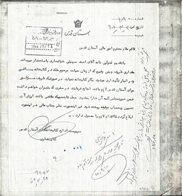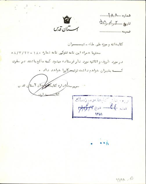 مکاتبات کتابداری سرپرست اداره کتابخانههای آستان قدس رضوی پیرامون کتابخانه و موزه ملی ملک به تاریخ ۱۳۵۸ش