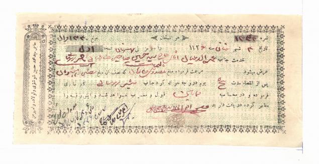 تعدادی برات تجارتخانه حاجی سید حسین شوشتری و اولاده رامهرمز در وجه غلامرضا بهبهانی، مشیر بهبهانی و عده ای دیگر به تاریخ 1326ق