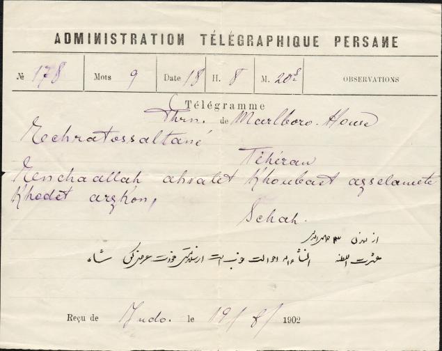 تلگرافی از لندن به عشرتالسلطنه در خصوص احوالپرسی از وی٬ رسید صحافی از بابت کتاب حقوق جزایی٬ دعوتنامهای از طرف یحیی الرضوی جهت شرکت در عزاداری امام رضا در باغ فردوس به تاریخ ۱۹۰۲م / 1309ه. ق