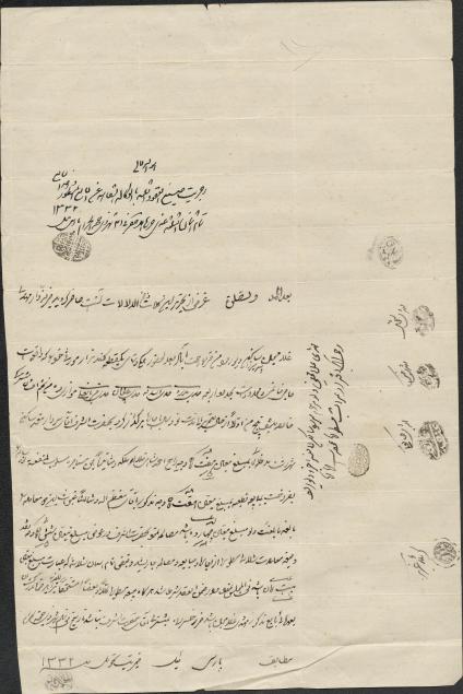 مبایعه وگذاری یک قطعه گندم زار موروثی به تاریخ 1332ق قاجاریه صفر 1193 قمری (قرن 12) - 15 شعبان 1342 قمری (قرن 14)