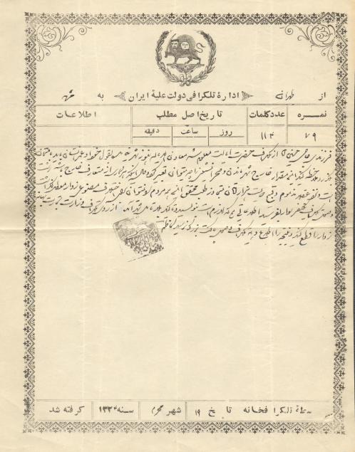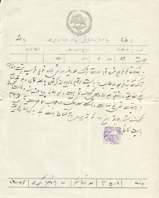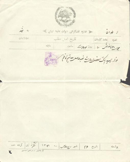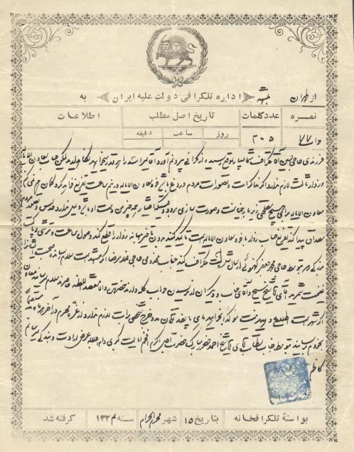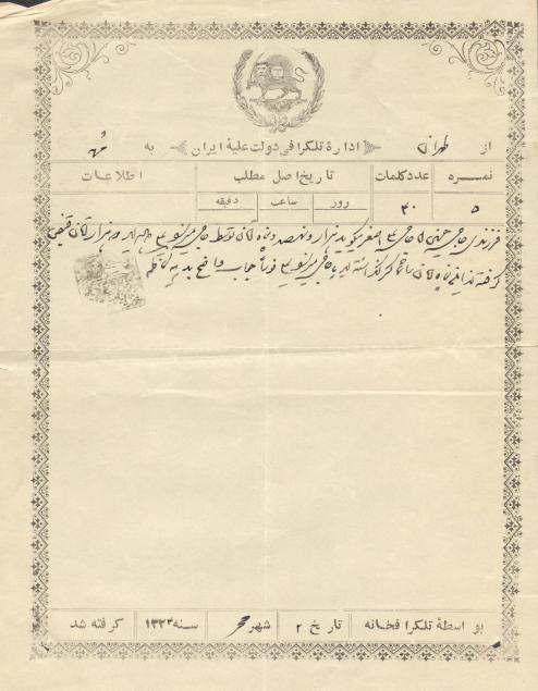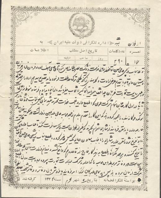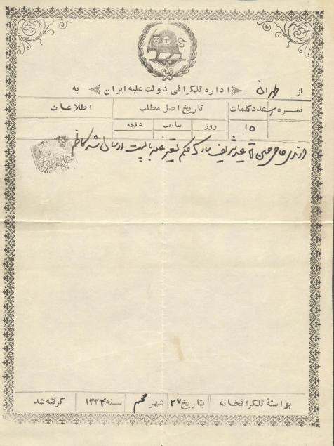 تلگراف به حسین آقا ملک از طهران به مشهددر 1324 قاجاریه صفر 1193 قمری (قرن 12) - 15 شعبان 1342 قمری (قرن 14)