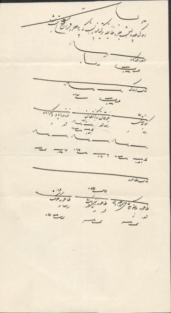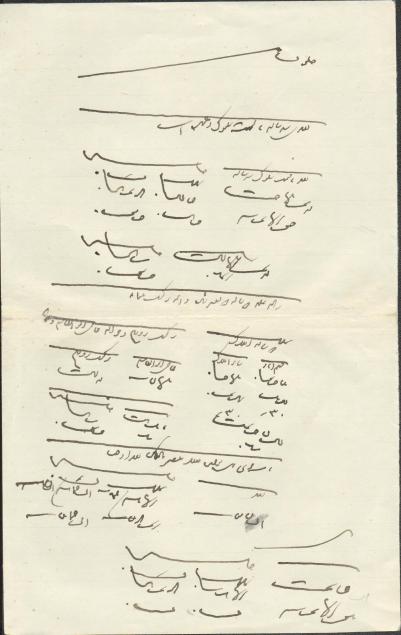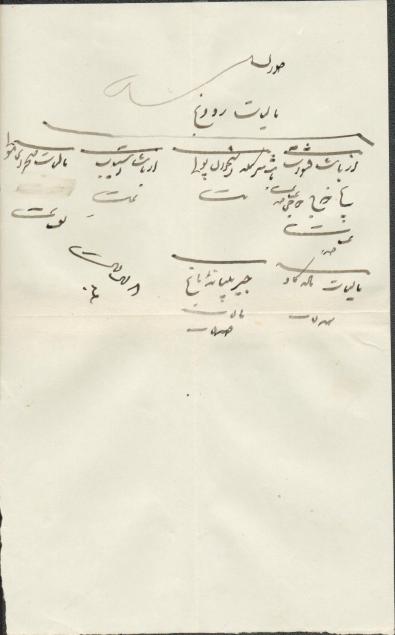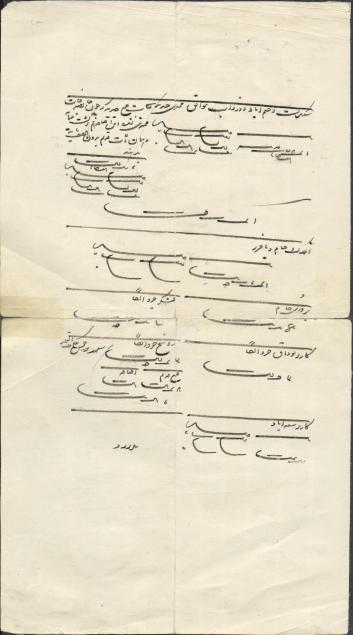 صورت های مالیات املاک رونج، کلاته جات در محرم بارس ئیل 1320 و مداخل حالیه املاک ، مالیات املاک موافق ممیزی جدید و صورت موقوفات مستمر جامع نیشابور ، صورت املاک جدید النسق جزء طایفه ترکیه ، املاک دار بلوک قیر متعلق به ملک التجار، به سیاق